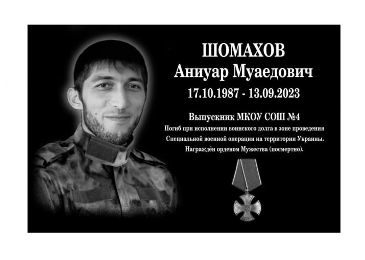 Аниуар Муаедович Шомахов геройски погиб 13 сентября 2023 года в ходе специальной военной операции по защите мирного населения Донецкой и Луганской Народных Республик.