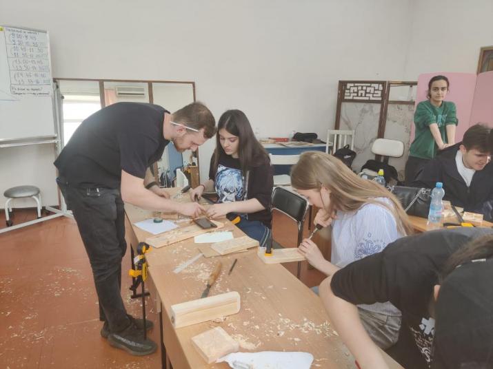 Цикл по реставрации мебели провел студент четвертого курса «26 КАДР», победитель международной выставки Denkmal в Москве в категории “Реставрация произведений из дерева”, победитель конкурса WorldSkills в Иркутске Боч Воронин. После ознакомительной лекции студенты закрепляли навыки по резьбе на сосновых досках.