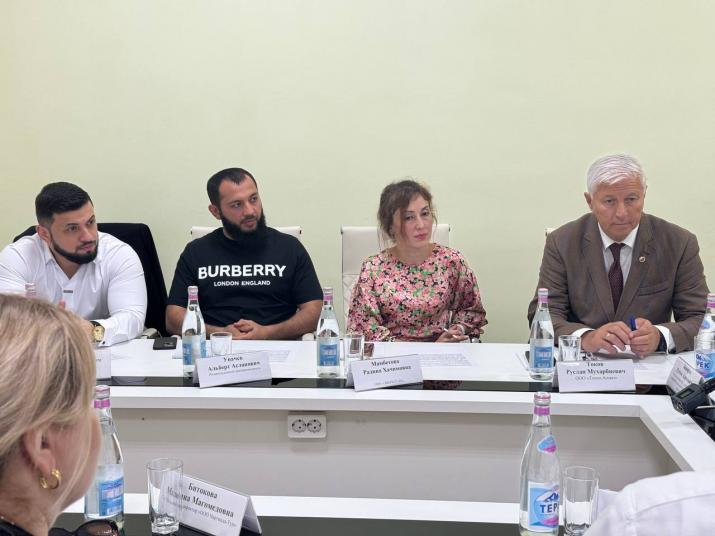На пресс-конференции собрались заместитель министра экономического развития КБР Рустам Башоров, директор центра «Мой бизнес» Хадис Дударов и местные предприниматели.