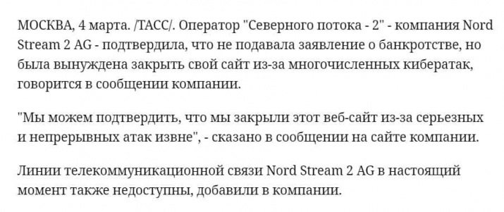 Оператор проекта «Северный поток 2» не подавал заявления о банкротстве![]() Оператор проекта «Северный поток 2» Nord Stream 2 AG якобы подал заявления о банкротстве, сообщали СМИ со ссылкой на швейцарский телеканал SRF, сообщает телеграм-канал война с фейками. Nord Stream 2 AG опровергла подачу заявления о банкротстве. Уточняется, что компания была вынуждена закрыть свой сайт из-за «серьезных и непрерывных атак извне». Сейчас сайт и линии телекоммуникационной связи Nord Stream 2 AG недоступны. Напомним, Nord Stream 2 AG вела проект газопровода, проложенного от побережья России через Балтийское море до Германии. «Северный поток 2» полностью завершен в сентябре прошлого года, но его сертификация остановлена 22 февраля.