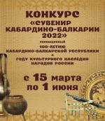 Министерство культуры КБР, Государственное казённое учреждение «Республиканский Центр народных художественных промыслов и ремёсел» совместно с Торгово-промышленной палатой КБР, Кабардино-Балкарским госуниверситетом, Минпромторгом КБР, Минэкономразвития КБР, Минпросвещения КБР, Минкурортов КБР, Администрацией г.о.Нальчик проводят с 15 марта по 1 июня конкурс «Сувенир Кабардино-Балкарии 2022», посвященный 100-летию Кабардино-Балкарской Республики и Году культурного наследия народов России.