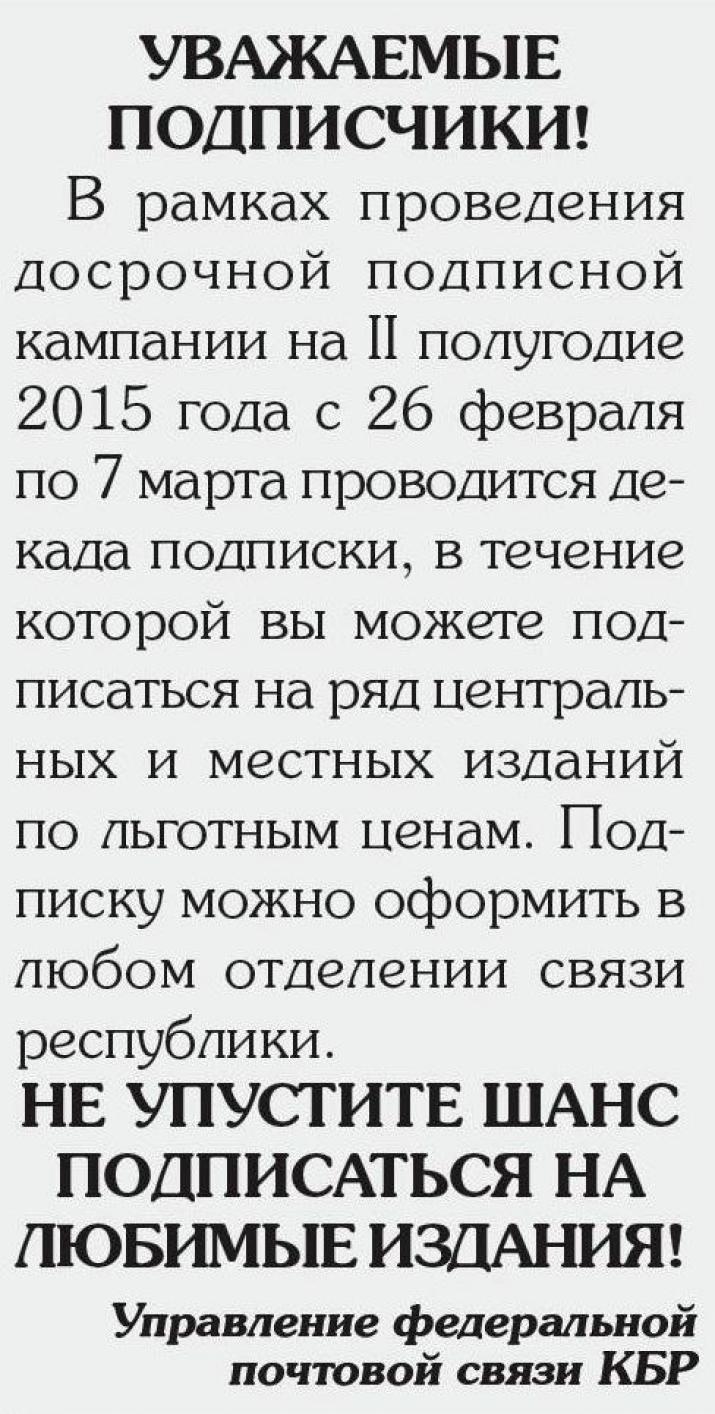 УВАЖАЕМЫЕ ПОДПИСЧИКИ!В рамках проведения досрочной подписной кампании на II полугодие 2015 года с 26 февраля по 7 марта проводится декада подписки, в течение которой вы можете подписаться на ряд центральных и местных изданий по льготным ценам. Подписку можно оформить в любом отделении связи республики. Управление федеральной почтовой связи КБР