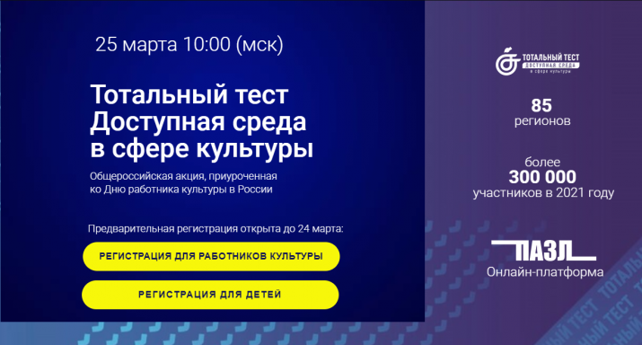 Доступная среда в сфере культуры![]() 25 марта по всей стране стартует Тотальный тест «Доступная среда в сфере культуры» - общероссийская ежегодная акция, приуроченная в 2022 году ко Дню работника культуры в России. Тематический акцент будет сделан на особенности организации доступной среды в музеях, театрах, училищах и школах искусств, а также объектов исторического наследия. Для участия в тестировании необходима предварительная регистрация по ссылке: www.total-test.ru. Тестирование можно пройти до 31 марта включительно. Тест предусмотрен для взрослой аудитории (50 вопросов) и для детской аудитории (20 вопросов). К участию в акции приглашаются работники сферы культуры, представители региональных и муниципальных исполнительных органов власти, молодежной политики, а также обучающихся детских школ искусств и училищ ожидается, что «Тотальный тест «Доступная среда в сфере культуры» охватит свыше 30 субъектов РФ. По итогам мероприятия все участники получат электронные сертификаты о прохождении «Тотального тест «Доступная среда в сфере культуры». Мероприятие реализуется Автономной некоммерческой организацией дополнительного профессионального образования «Центр обучения профессионалов здравоохранения» в рамках проекта «Тотальный тест «Доступная среда в сфере культуры», с использованием гранта, предоставленного Фондом-оператором президентских грантов по развитию гражданского общества. Партнерами мероприятия выступают Общероссийский народный фронт и Национальная ассоциация участников рынка ассистивных технологий «АУРА-Тех».