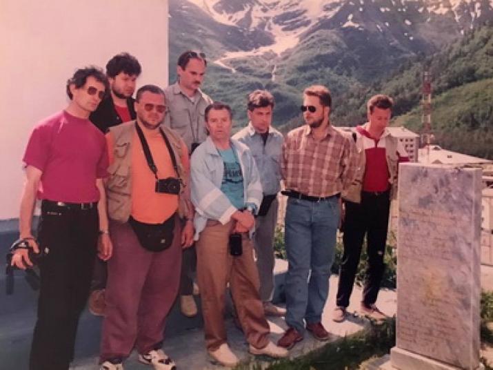 – Установить плиту решили в том месте, где наши войска когда-то остановили фашистов. Автором и главным реализатором этой идеи был Александр Рябушев, собкор «Российской газеты» на Северном Кавказе, награждённый орденом Мужества за Будённовск. Тогда мы собрали коллег-журналистов с целью продемонстрировать всему миру, что профессионалы должны быть вместе перед лицом войны. Проехали по Ставрополью, почтили память погибших коллег в Будённовске и КЧР. Потом приехали в Кабардино-Балкарию, в Приэльбрусье. А. Рябушев говорил, что мероприятие профинансировал Андрей Разин, продюсер группы «Ласковый май», он тогда был депутатом Думы Ставропольского края. Акция мира «Давайте не встречаться на войне» – так мы её назвали – состоялась в том числе и благодаря помощи местных властей. В ней было минимум официоза, максимум смысла. Должен сказать, Александр Рябушев – уникальный человек. Необыкновенной энергии и организаторского таланта. Сейчас он уехал на родину в Калининград, живёт и работает там.